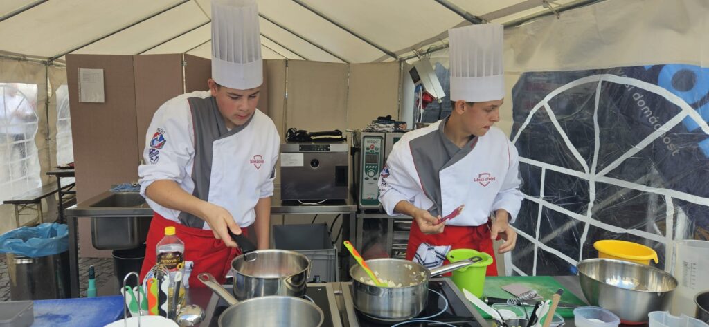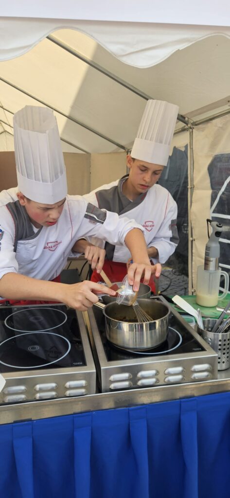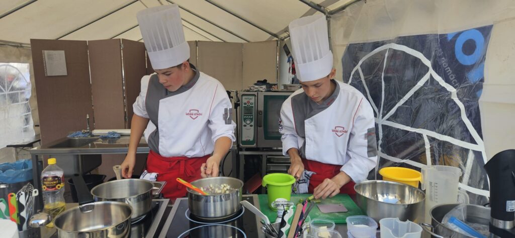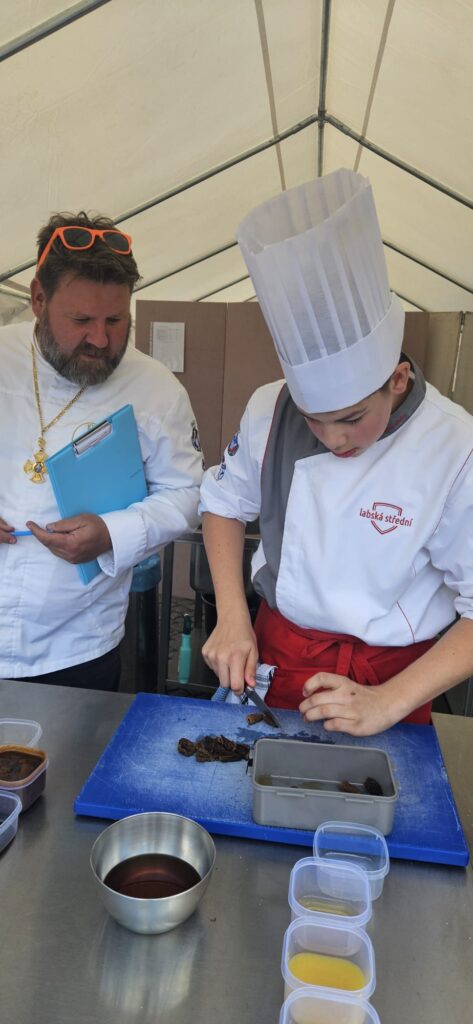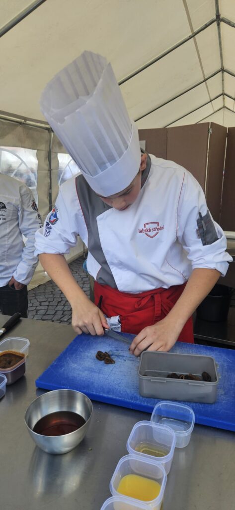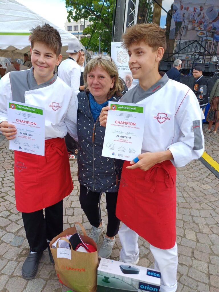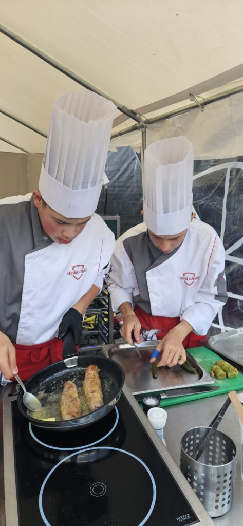 Dne 24. 5. 2025 se naši žáci zúčastnili prestižní gastronomické soutěže v rámci Městských slavností Magdaleny Dobromily Rettigové v Litomyšli. Jejich úkolem bylo připravit 4 porce teplého pokrmu z vepřové panenky během 50 minut.