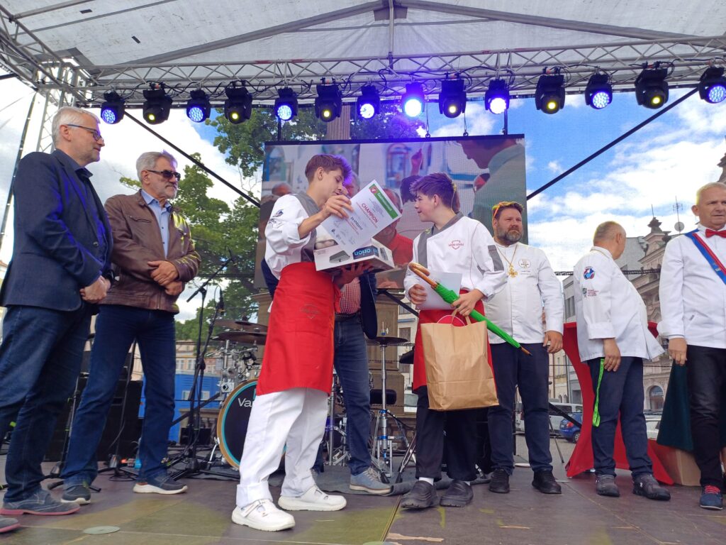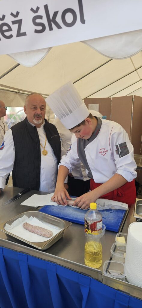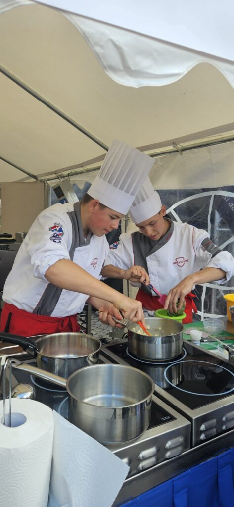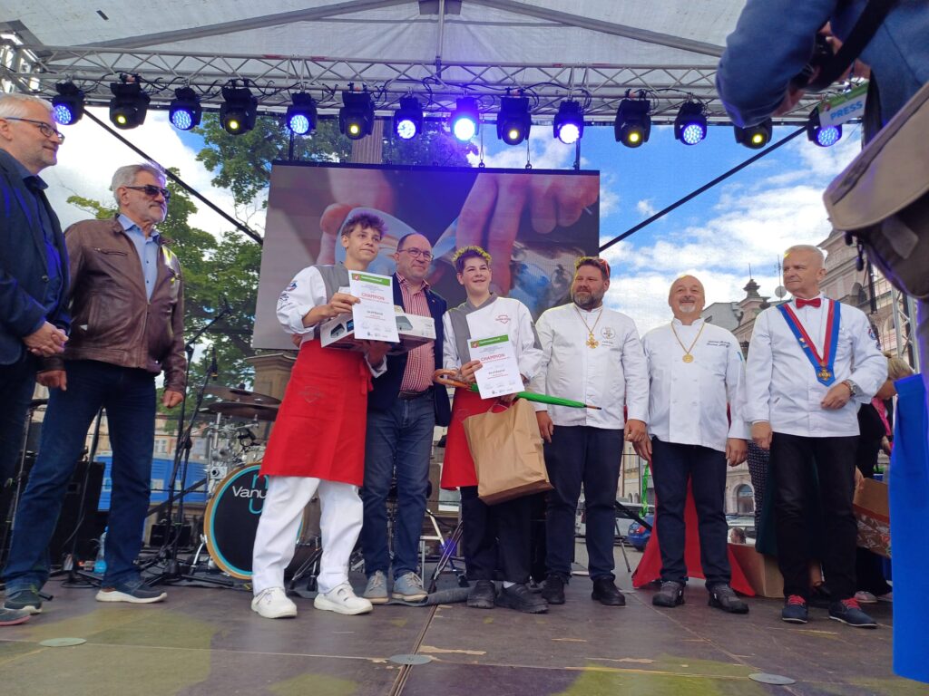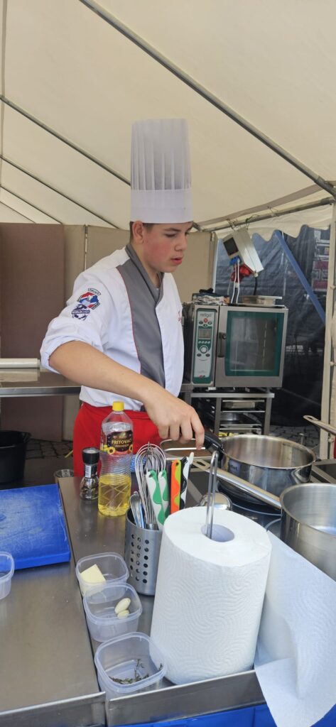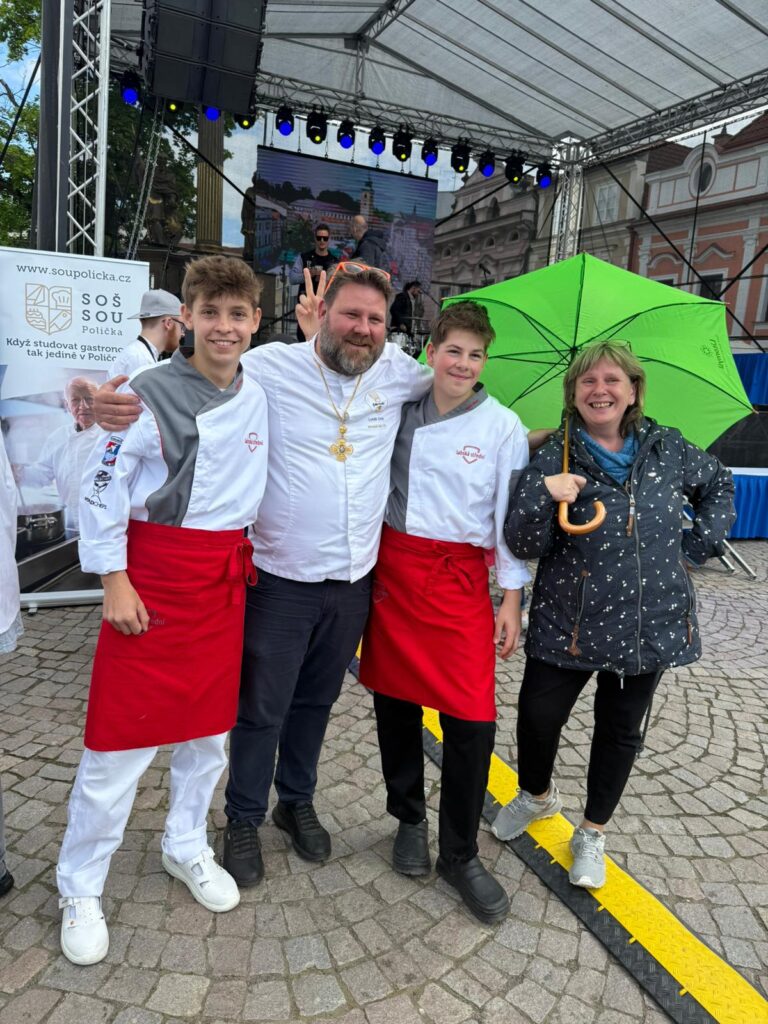 Dne 24. 5. 2025 se naši žáci zúčastnili prestižní gastronomické soutěže v rámci Městských slavností Magdaleny Dobromily Rettigové v Litomyšli. Jejich úkolem bylo připravit 4 porce teplého pokrmu z vepřové panenky během 50 minut.