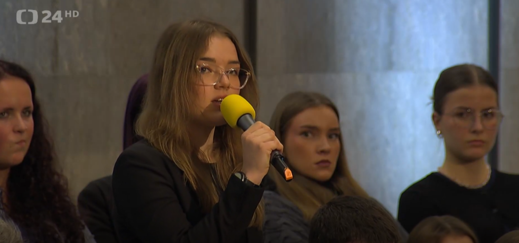 Do aktivní debaty se zapojila i naše studentka Barbora Čermáková ze třídy 1. VS, která v první části pořadu položila svůj dotaz jednomu z hostů pořadu, historikovi Petru Blažkovi, a tím přispěla k diskusi o dopadech komunismu na tehdejší i současnou společnost.